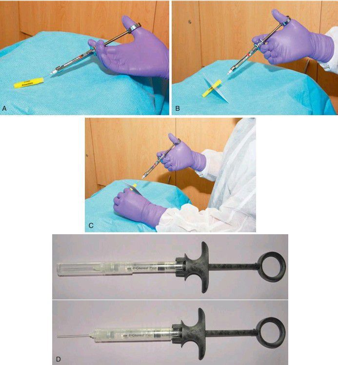 (A) Scoop technique for resheathing anesthetic needle. (B) Scoop needle resheathing technique using cardboard holder to stabilize needle cap. (C) Clinician holding needle cap with protective cardboard on the cap while resheathing needle. (D) Self-resheathing needle.
