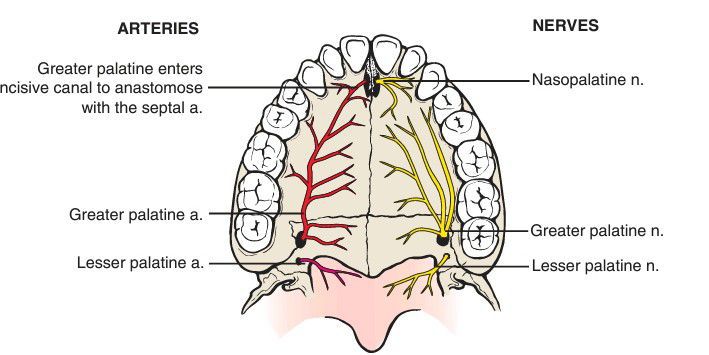 Greater palatine and incisive nerves innervating soft tissue over the hard palate.