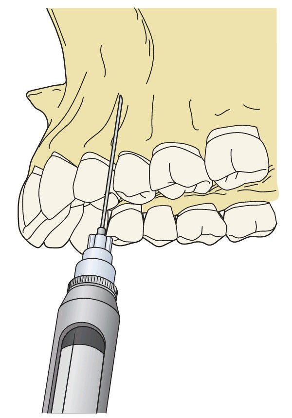 Site of local anesthetic deposition for infiltration technique to anesthetize individual maxillary teeth. Needle tip should be positioned adjacent to the bone overlying the apex of the tooth to be anesthetized.