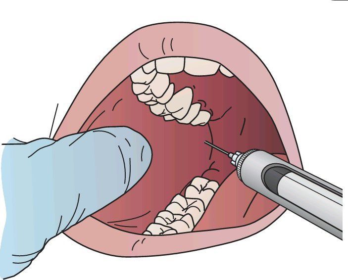 During an inferior alveolar nerve block using a long needle, about two-thirds to three-fourths of the needle should be into the soft tissues. If all of the needle is buried within the tissues before bone is detected by the needle tip, the needle should be partially withdrawn and the barrel moved more posteriorly before again advancing the nee
