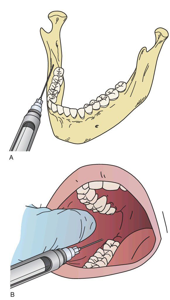 Needle placement for anesthetizing the long buccal nerve. The needle tip penetrates tissue just lateral and posterior to the site of the lower third molar. (A) Hard tissue anatomy. (B) Surface anatomy.
