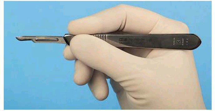 The scalpel handle is held in the pen grasp to allow maximal control.
