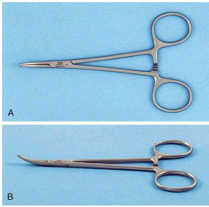 A) Superior view of the hemostat used for oral surgery. (B) Oblique view of the curved hemostat. Straight hemostats are also available.
