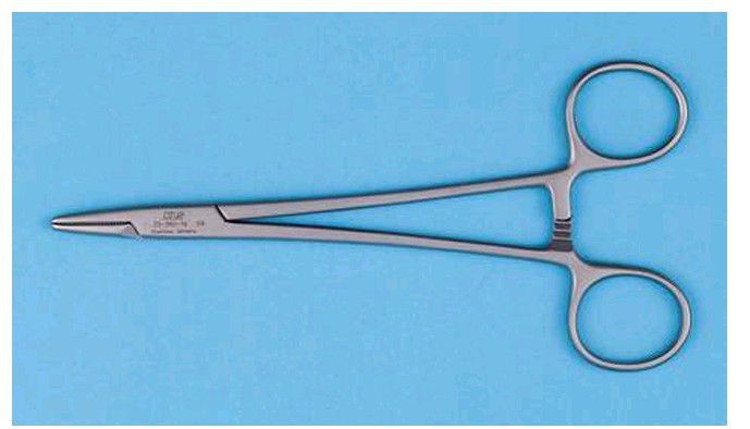 A needle holder has a locking handle and a short, blunt beak.