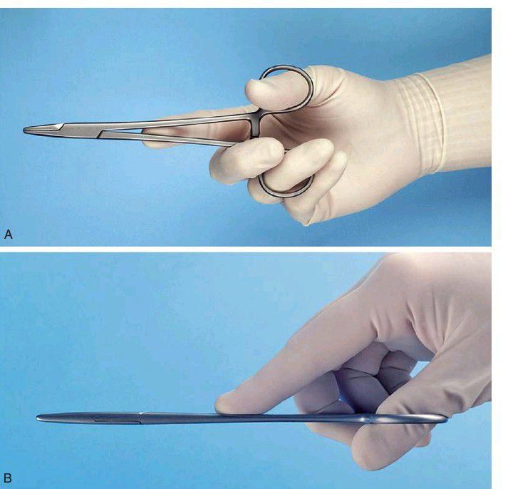 The needle holder is held by using the thumb and ring finger in rings (A) and the first and second f ingers to control the instrument (B).