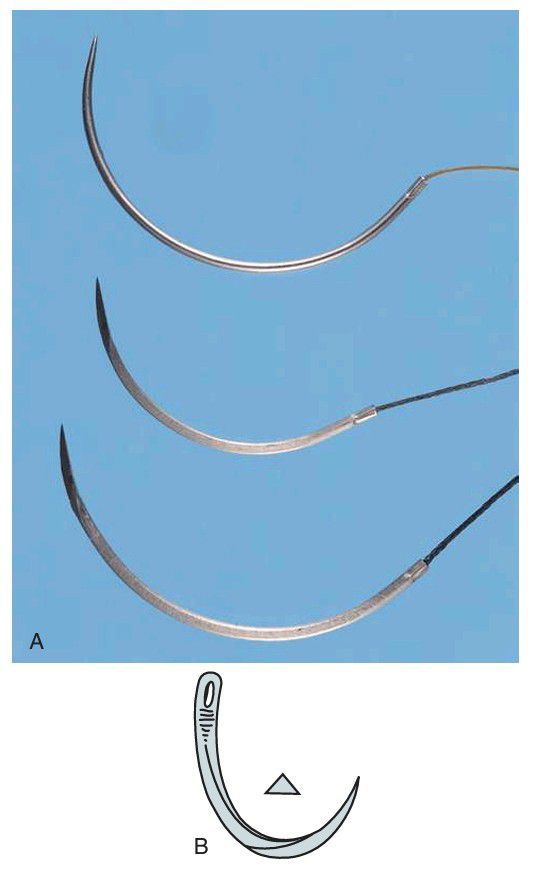A) Comparison of needles used in oral surgery. Top, C-17 needle, which usually holds a size 4-0 suture. Middle, PS-2 needle. Bottom, SH. All are cutting needles, and the suture material is swaged onto the needle. (B) The tip of the needle used to suture mucoperiosteum is triangular in cross section to make it a cutting needle.