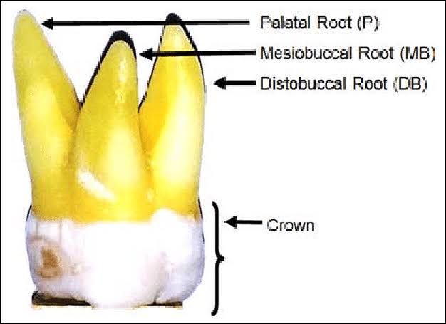 The upper second molar typically has three roots: a single palatal root and two buccal roots (mesiobuccal and distobuccal), meaning the most common anatomy is three roots with three separate canals; however, variations in root number and canal configuration can occur depending on the individual, with some cases presenting fused roots or additional canals.