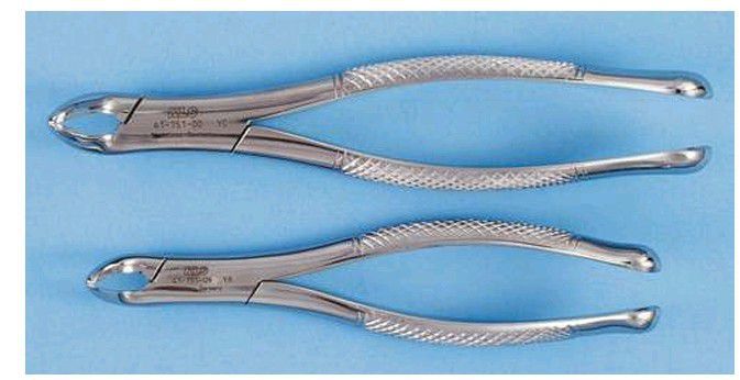 The No. 151S forceps (bottom) are a smaller version of the No. 151 forceps (top) and are used to extract primary teeth.