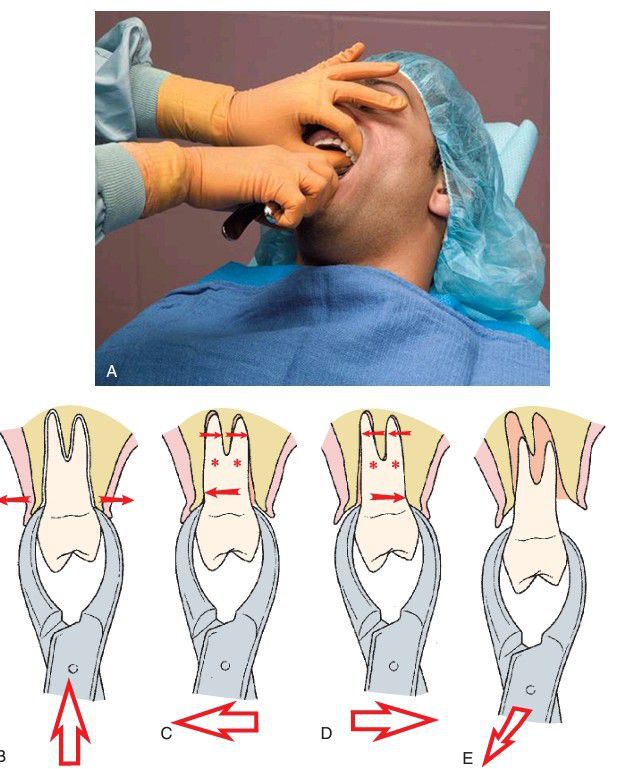 (A) Maxillary premolars are removed with the No. 150 forceps. The hand position is similar to that used for anterior teeth. (B) Firm apical pressure is applied first to the lower center of rotation as far as possible and to expand crestal bone. (C) Buccal pressure is applied initially to expand the buccocortical plate. The apices of roots are pushed lingually and are therefore subject to fracture. (D) Palatal pressure is applied, but less vigorously than buccal pressure. (E) The tooth is delivered in the bucco-occlusal direction with a combination of buccal and tractional forces.