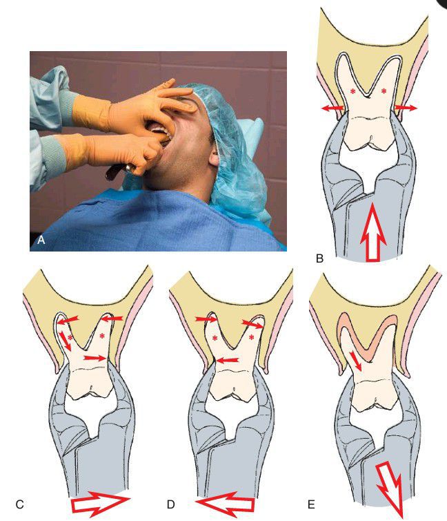 (A) Extraction of maxillary molars. Soft tissues of the lips and cheek are retracted, and the alveolar process is grasped with the opposite hand. (B) Forceps beaks are seated apically as far as possible. (C) Luxation is begun with strong buccal force. (D) Lingual pressures are used only moderately. (E) The tooth is delivered in the bucco-occlusal direction. Asterisk notes the center of rotation.