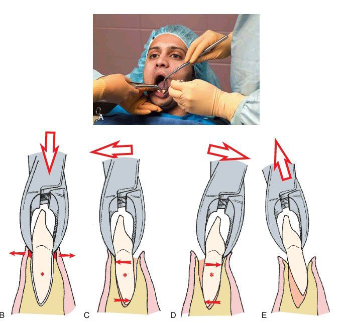 (A) When extracting mandibular anterior teeth, No. 151 forceps are used. The assistant retracts the patient’s cheek and provides suction. (B) The forceps are seated apically as far as possible. (C) Moderate labial pressure is used to initiate the luxation process. (D) Lingual force is used to continue the expansion of bone. (E) The tooth is delivered in the labial-incisal direction. Asterisk notes the center of rotation.