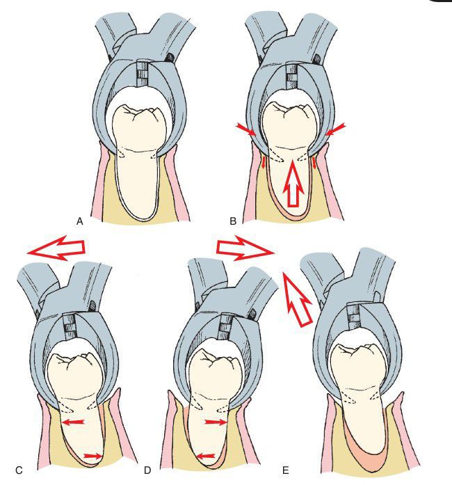 (A) No. 23 forceps are carefully positioned to engage the bifurcation area of the lower molar. (B) The handles of the forceps are squeezed forcibly together, which causes the beaks of the forceps to be forced into the bifurcation and exerts tractional forces on tooth. (C) Strong buccal forces are then used to expand the socket. (D) Strong lingual forces are used to luxate the tooth further. (E) The tooth is delivered in the bucco-occlusal direction with buccal and tractional forces.