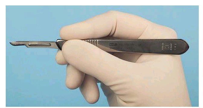 The scalpel handle is held in a pen grasp for maximal control and tactile sensitivity