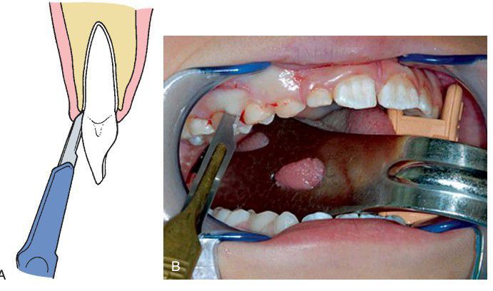 (A) The knife is angled slightly away from the tooth and incises soft tissue, including the periosteum, at crestal bone. (B) The incision is started posteriorly and is carried anteriorly, with care taken to incise completely through the interdental papilla