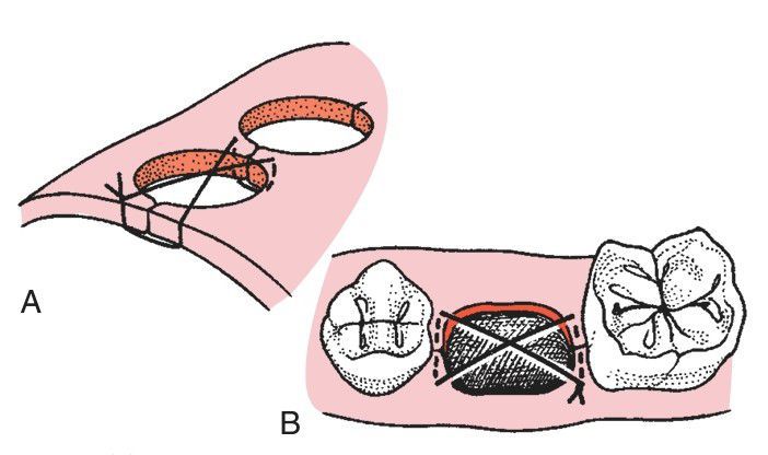 A) Figure-of-eight suture occasionally placed over the top of the socket to aid in hemostasis. (B) This suture is usually performed to help maintain a piece of oxidized cellulose in the tooth socke