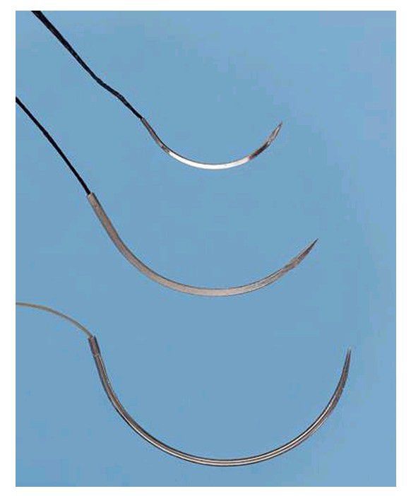 The shapes and types of needles most commonly used in oral surgery are the three-eighths circle and half-circle cutting needles shown here. Top, PS-2. Middle, FS-2. Bottom, X-1.