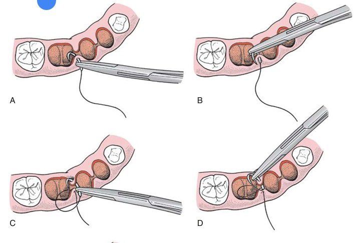 When the mucosal flap is back in position, the suture is passed through two sides of the socket in separate passes of the needle. (A) The needle is held by the needle holder and passed through the papilla, usually that of mobile elevated tissue first. (B) The needle holder is then released from the needle; it regrasps the needle on the underside of tissue and is turned through the flap with care taken to never grasp the needle’s tip. (C) The needle is then passed through the opposite side of soft tissue papilla in similar fashion.