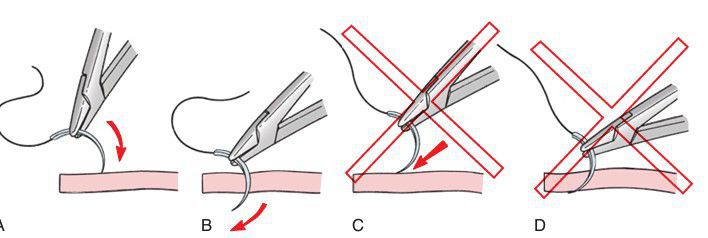 (A) When passing through the soft tissue of mucosa, the needle should enter the surface of tissue at a right angle. (B) The needle holder should be turned so the needle passes easily through tissue at a right angle. (C) If the needle enters soft tissue at an acute angle and is pushed (rather than turned) through tissue, tearing of the mucosa with the needle or with the suture is likely to occur (D).