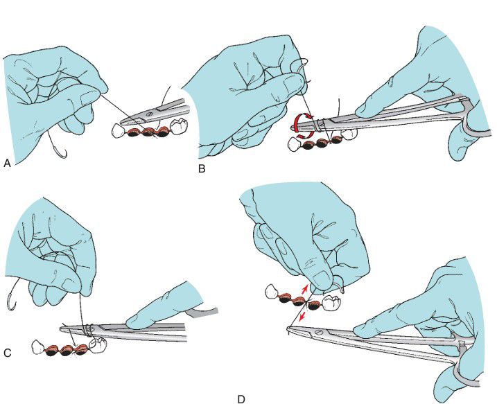 Most intraoral sutures are tied with an instrument tie. (A) The suture is pulled through tissue until the short tail of the suture (approximately 1 to 2 cm long) remains. The needle holder is held horizontally by the right hand in preparation for the knot-tying procedure. (B) The left hand then wraps the long end of the suture around the needle holder twice in the clockwise direction to make two loops of suture around the needle holder. (C) The surgeon then opens the needle holder and grasps the short end of the suture very near its end. (D) The ends of the suture are then pulled to tighten the knot. The needle holder should not pull the suture it is holding at all until the knot is nearly tied to avoid lengthening that portion of the suture. Most intraoral sutures are tied with an instrument tie.