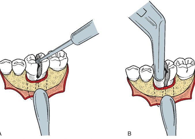 If the lower molar is difficult to extract, it can be sectioned into single-rooted teeth. (A) The envelope incision is reflected, and a small amount of crestal bone is removed to expose the bifurcation. A drill is then used to section the tooth into mesial and distal halves. (B) Lower universal forceps are used to remove the two crown and root portions separately.