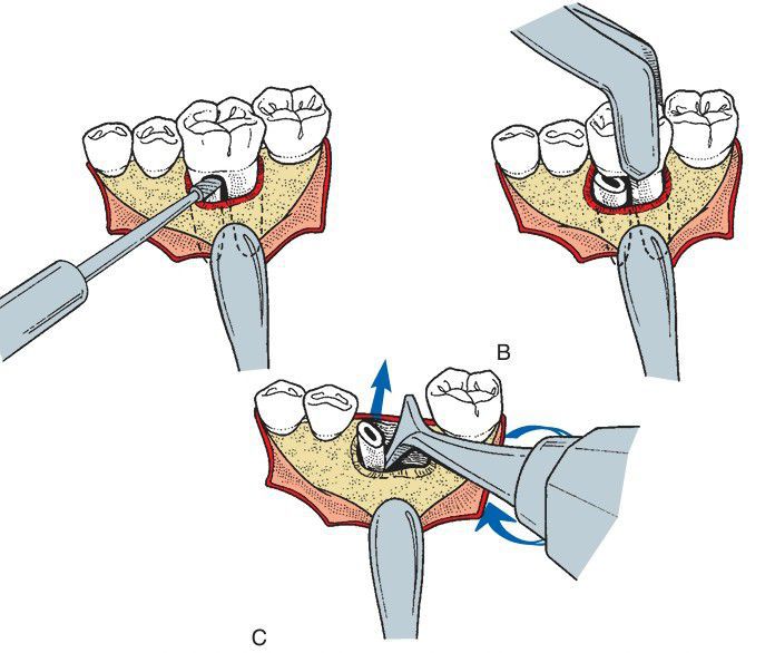 (A) An alternative method of sectioning is to use the burr to remove the mesial root from the f irst molar. (B) The No. 178 forceps are then used to grasp the crown of the tooth and remove the crown and the distal root. (C) The Cryer elevator is then used to remove the mesial root. The point of the Cryer elevator is inserted into the empty socket of the distal root and turned in a wheel-and-axle fashion with the sharp point engaging interseptal bone and root, elevating the mesial root from its socket.