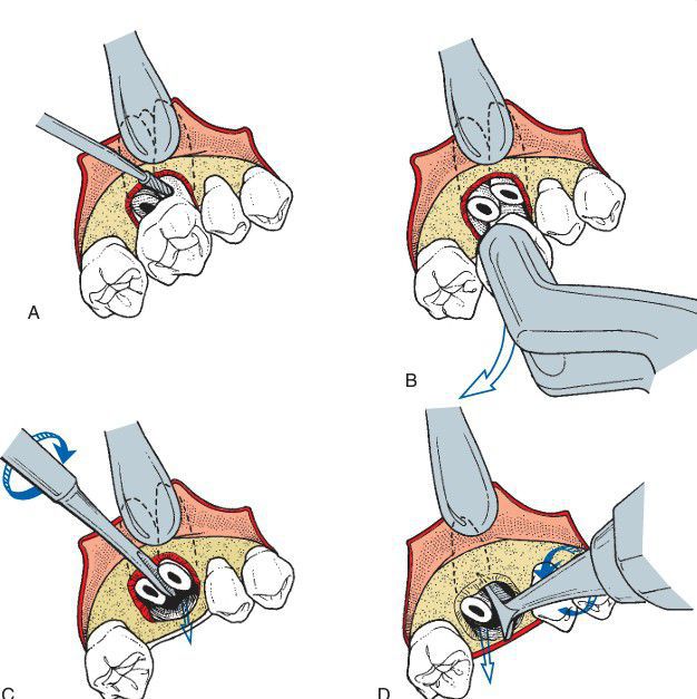 A) When an intact maxillary molar must be divided for judicious removal (as when extreme divergence of roots is found), a small envelope incision is made, and a small amount of crestal bone is removed. This allows the burr to be used to section the buccal roots from the crown portion of the tooth. (B) Upper molar forceps are then used to remove the crown portion of the tooth along with the palatal root. The tooth is delivered in the bucco-occlusal direction, and no palatal pressure is used because it would probably cause a fracture of the palatal root from the crown portion. (C) The straight elevator is then used to mobilize the buccal roots and can occasionally be used to deliver these roots. (D) The Cryer elevator can be used in the usual fashion by placing the tip of the elevator into the empty socket and rotating it to deliver the remaining root.