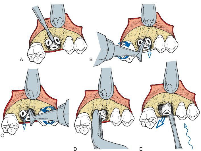 (A) If the crown of the upper molar has been lost to caries or has been fractured from the roots, a small envelope incision is reflected, and a small amount of crestal bone is removed. The burr is then used to section the three roots into independent portions. (B) After the roots have been luxated with the small straight elevator, the mesiobuccal root is delivered with the Cryer elevator placed into the slot prepared by the burr. (C) Once the mesiobuccal root has been removed, the Cryer elevator is again used to deliver the distal buccal root. The tip of the Cryer elevator is placed into the empty socket of the mesiobuccal root and turned in the usual fashion to deliver the tooth root. (D) Maxillary root forceps occasionally can be used to grasp and deliver the remaining root. The palatal root can then be delivered with the straight or Cryer elevator. If the straight elevator is used, it is placed between the root and the palatal bone and gently rotated to and fro in an effort to displace the palatal root in the bucco-occlusal direction. (E) The small straight elevator can be used to elevate and displace the remaining root of the maxillary third molar in the bucco-occlusal direction with gentle to-and-fro motio