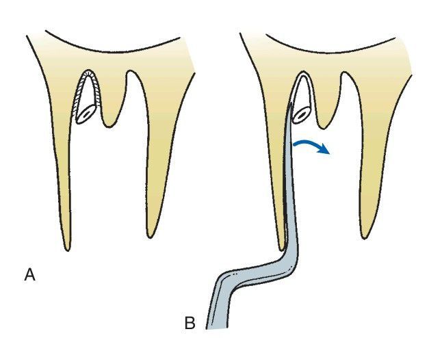 (A) When a small (2 to 4 mm) portion of the root apex is fractured from the tooth, the root tip pick can be used to retrieve it. (B) The root tip pick is teased into the periodontal ligament space and is used to gently luxate the root tip from its socket.