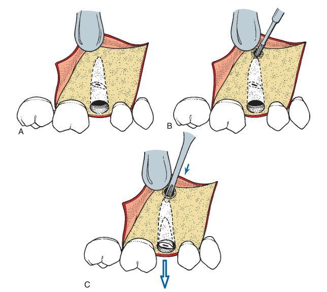 (A) The open-window approach for retrieving the root is indicated when buccocrestal bone must be maintained. The three-cornered flap is reflected to expose the area overlying the apex of the root fragment being recovered. (B) A burr is used to uncover the apex of the root and to allow sufficient access for the insertion of the straight elevator. (C) The small straight elevator is then used to displace the tooth out of the tooth socket.