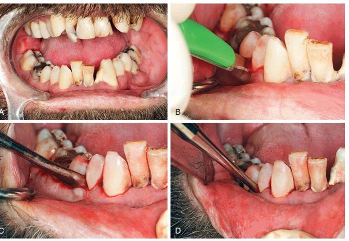 A) This patient’s remaining mandibular teeth are to be extracted. The broad zone of attached gingiva is demonstrated in adequate vestibular depth. (B) After adequate anesthesia is achieved, the soft tissue attachment to teeth is incised with the No. 15 blade. The incision is carried around the necks of the teeth and through the interdental papilla. (C) The periosteal elevator is used to reflect labial soft tissue just to the crest of labioalveolar bone. (D) The small straight elevator is used to luxate teeth before forceps are used. The surgeon’s opposite hand is reflecting soft tissue and stabilizing the mandible. Teeth adjacent to the mandibular canine are extracted f irst, which makes extraction of the remaining canine tooth easier to accomplish.