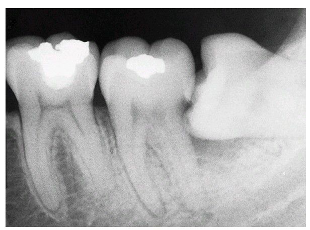 Radiograph of a mandibular third molar impacted against a second molar with bone loss resulting from the presence of a third molar.