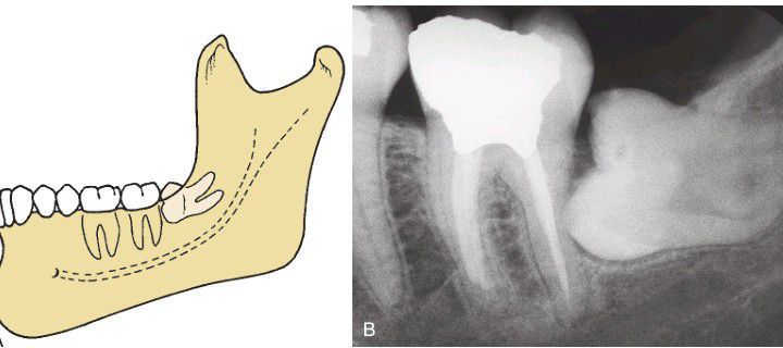 A) Horizontal impaction—an uncommon and more difficult to remove impaction than a mesioangular impaction. (B) The occlusal surface of the horizontal impacted third molar is usually immediately adjacent to the root of the second molar, which often produces early severe periodontal disease.