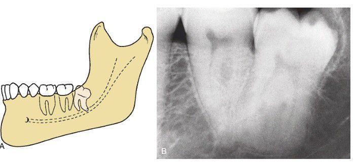 (A) Distoangular impaction—an uncommon and the most difficult of the four types of impactions to remove. (B) The occlusal surface of distoangular impaction is usually embedded in the ramus of the mandible and requires significant bone removal for extraction.