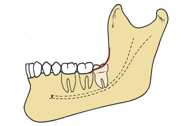 . The occlusal plane of the impacted tooth is between the occlusal plane and the cervical line of the second molar.