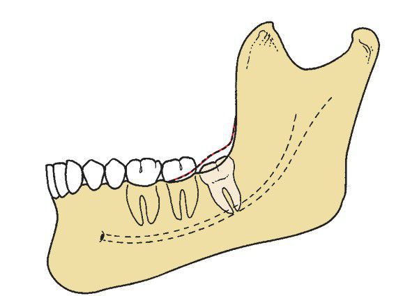 Partial bony impaction in which part of the tooth—usually a posterior aspect—is covered with bone and requires bone removal or tooth sectioning for extraction