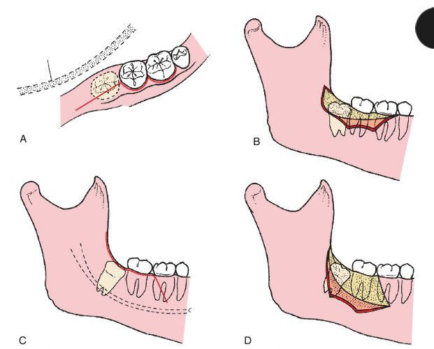 (A) The envelope incision is most commonly used to reflect soft tissue for removal of the impacted third molar. Posterior extension of the incision should laterally diverge to avoid injury to the lingual nerve. (B) The envelope incision is laterally reflected to expose bone overlying the impacted tooth. (C) When a three-cornered flap is made, a releasing incision is made at the mesial aspect of the second molar. (D) When the soft tissue flap is reflected by means of a releasing incision, greater visibility is possible, especially at the apical aspect of the surgical field.