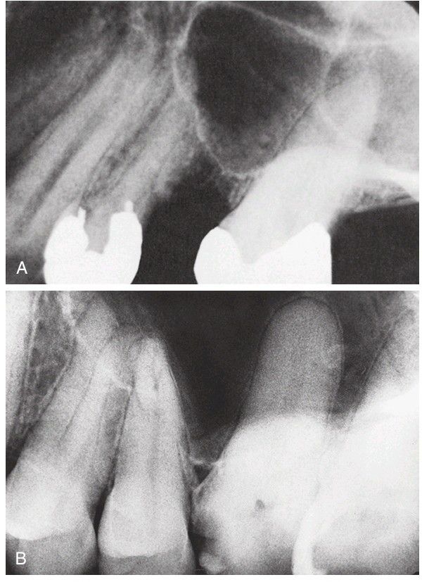 (A) Floor of sinus associated with roots of teeth. If extraction is required, the tooth should be removed surgically. (B) Maxillary molar teeth immediately adjacent to the sinus present increased danger of sinus exposure.