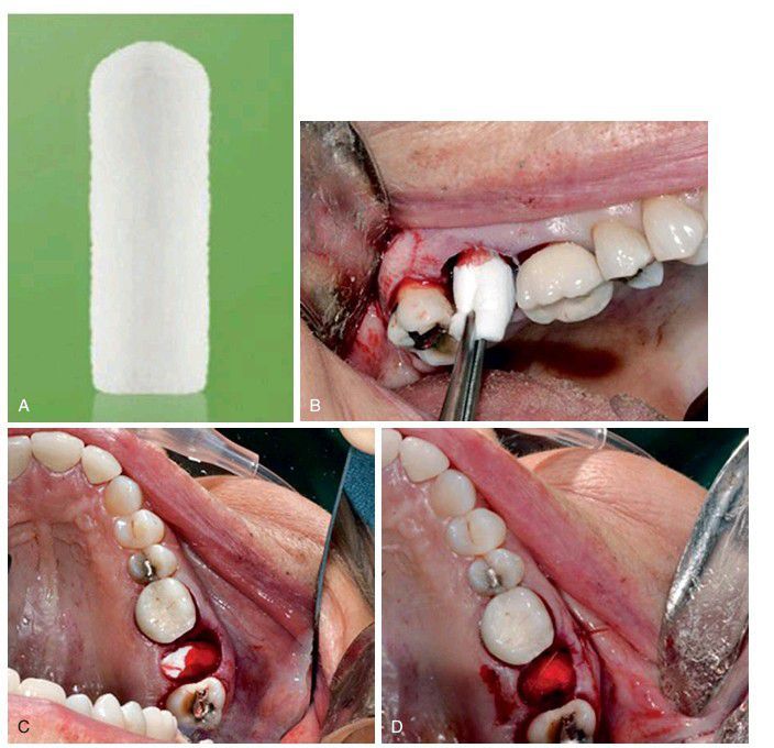 (A) Bicon resorbable collagen plug. (B) Collagen being placed into extraction socket. (C) Collagen in extraction socket. (D) Suture used to help retain collagen plug. (B–D, Courtesy Dr. Edward Ellis III, University of Texas Health Science Center, San Antonio.)