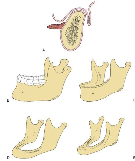 (A) Ideal shape of the alveolar process in the denture-bearing area. (B–E) Progression of bone resorption in the mandible after tooth extraction.
