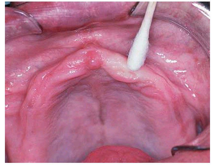Palpation reveals hypermobile tissue that will not provide an adequate base in the denture-bearing area.