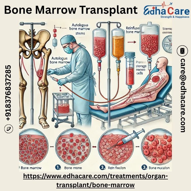 A bone marrow transplant, or BMT, is a procedure where unhealthy bone marrow cells are replaced with healthy ones to treat certain cancers, blood disorders, and autoimmune diseases. It involves patient evaluation, conditioning therapy (chemotherapy or radiation), and different transplant types (autologous, allogeneic, umbilical cord blood). And stem cell infusion into the bloodstream to produce healthy blood cells, and requires careful monitoring and medication post-transplant for successful treatment of conditions like leukemia, lymphomas, and anemias. https://www.edhacare.com/treatments/organ-transplant/bone-marrow