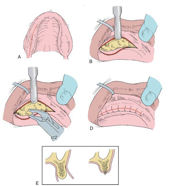 (A) Incision extended along the crest of the alveolar ridge distally to the superior extent of the tuberosity area. (B) Elevated mucoperiosteal flap provides adequate exposure to all areas of bony excess. (C) Rongeur used to eliminate bony excess. (D) Tissue reapproximated with a continuous suture technique. (E) Cross-sectional view of the posterior tuberosity area, showing vertical reduction of bone and reapposition of the mucoperiosteal flap. (In some cases removal of large amounts of bone produces excessive soft tissue, which can be excised before closure to prevent overlapping.)