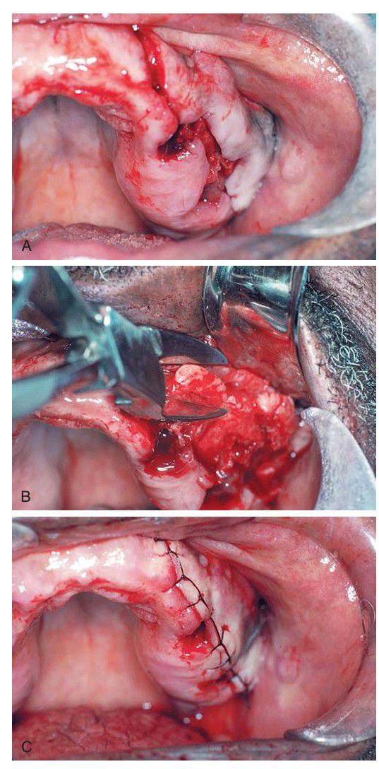 Removal of buccal exostosis. (A) Gross irregularities of the buccal aspect of the alveolar ridge. After tooth removal, incision is completed over the crest of the alveolar ridge. (Vertical-releasing incision in the cuspid area is demonstrated.) (B) Exposure and removal of buccal exostosis with a rongeur. (C) Soft tissue closure using a continuous suture technique.