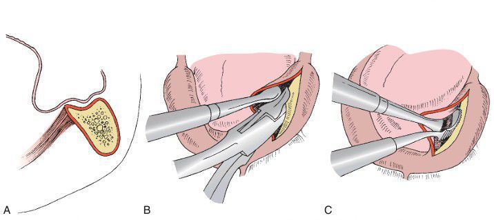 (A) Cross-sectional view of the posterior aspect of the mandible, showing concave contour of the superior aspect of the ridge from resorption. Mylohyoid ridge and external oblique lines form the highest portions of the ridge. (This can generally best be treated by alloplastic augmentation of the mandible but, in rare cases, may also require mylohyoid ridge reduction.) (B) Crestal incision and exposure of the lingual aspect of the mandible for removal of sharp bone in the mylohyoid ridge area. Rongeur or burr in a rotating handpiece can be used to remove bone. (C) Bone file used to complete recontouring of the mylohyoid ridge.
