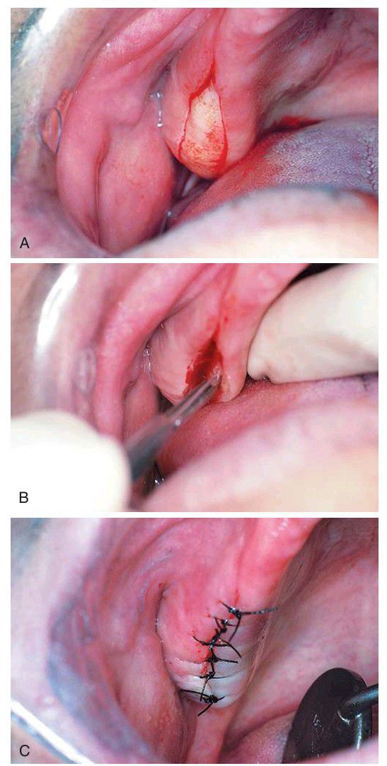 . (A) Elliptical incision. (B) Thinning of mucosal flaps by removal of underlying soft tissue. Digital pressure used to stabilize the tissue flaps during submucosal excision. (C) Tension-free readaptation of flaps.
