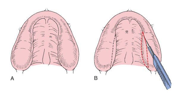 (A) View of excessive palatal tissue creating a narrow palatal vault and undercut areas. (B) Tangential excision of excess soft tissue.