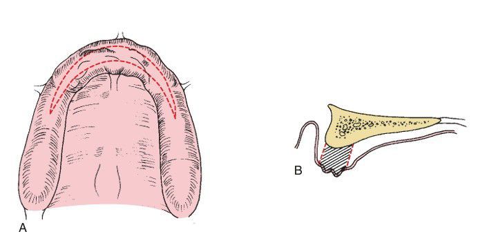 . (A) Outline of incisions for removal of the crestal area of hypermobile tissue. (B) Cross-sectional area demonstrating the amount of tissue to be excised. (This type of tissue excision should be considered only if adequate ridge height will remain after removal of tissue. If excision of this tissue will result in inadequate ridge height and obliteration of vestibular depth, some type of augmentation procedure should be considered.)
