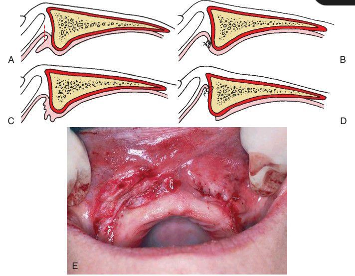 (A) Small, well-localized area of fibrous hyperplasia. This area can be removed with simple excision. (B) Closure of wound margins. (C) Large area of inflammatory fibrous hyperplasia. Removal and primary closure would result in elimination of the labial vestibule. (D) After supraperiosteal removal of excess tissue, the mucosal edge is sutured to the periosteum at the depth of the vestibule. (E) Postoperative view.The smaller well-localized area on the patient’s left has been removed and closed primarily. The larger area of excessive tissue on the right has been removed, and the wound margin has been sutured to the periosteum at the depth of the vestibule, which leaves exposed periosteum.