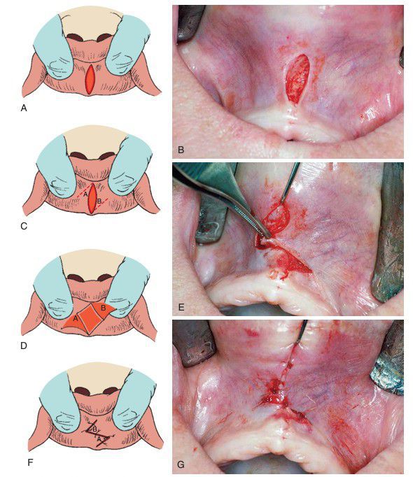 Z-plasty technique for elimination of the labial frenum. (A–B) Small elliptical excision of mucosa and underlying loose connective tissue. (C–E) Flaps are undermined and rotated to the desired position. (F–G) Closure with interrupted sutures.