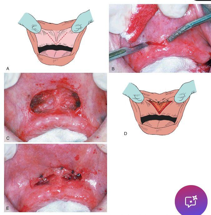 Release of the labial frenum with a wide base. (A–B) Wide V-type of incision made at the most inferior portion of frenal attachments in the area of the alveolar ridge. (C) Supraperiosteal dissection completed, releasing mucosa and fibrous frenal attachments. (D) Diagram of mucosal margins sutured to periosteum. (E) Mucosal margins sutured to periosteum at the depth of the vestibule.